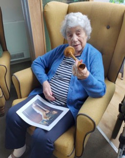 We can see one of our residents holding an early stethoscope used by doctors and placed by the ear to hear the internal sounds of a baby!